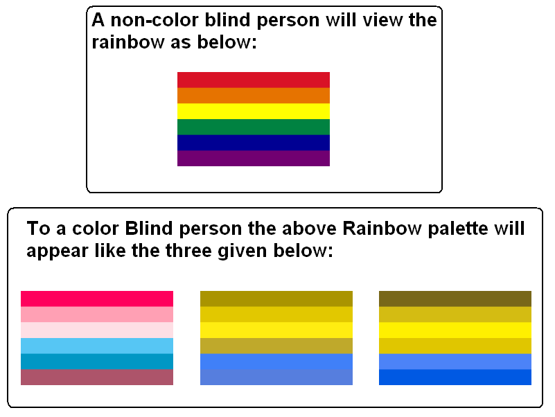 Оказывается, этот вопрос заинтересовал людей и до меня, и вот к чему они пришли: для большинства дальтоников радуга выглядит жовто-блакитной. Покой нам только снится.